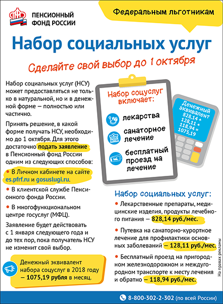 Если федеральный льготник подавал заявление об отказе от набора социальных услуг и планирует продолжать получать деньги, то обращаться в Пенсионный фонд не нужно. Если же решено в следующем году выбрать социальные услуги, до первого октября нужно подать заявление.